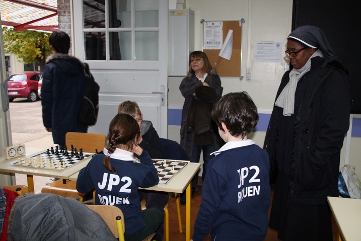 Puis, comme chaque année, JP II accueillit la première manche des championnats académiques individuels du jeu d’échecs, auquel plus de 90 enfants de plusieurs écoles ont participé. Cela se passa dans la bonne humeur et le fair-play entre les joueurs fut de mise. Sœur Chantal vint assister à plusieurs matches et put apprécier le nombre très important des écoliers de JP II enthousiasmés par son projet « Échecs au Primaire ».