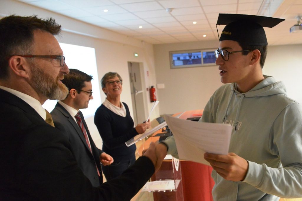 Une soixantaine d’élèves de Seconde, de Première et de Terminale, entourés de quelques parents, étaient réunis pour la cérémonie de remise de diplômes passés en allemand ou en anglais. Ces derniers portent le « mortar-board », célèbre chapeau plat porté lors des remises de diplômes dans les écoles et universités anglophones.