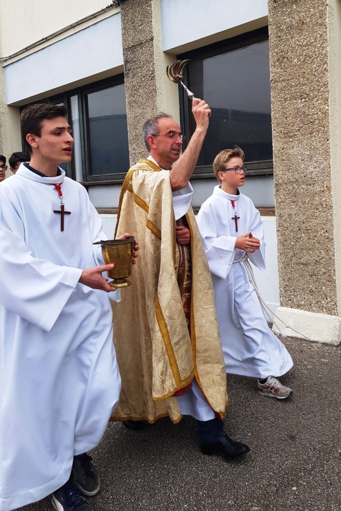 Après l’aspersion des membres de la Communauté Éducative, il a béni l’Institution : « Que Dieu tout-puissant bénisse cette école, pour qu’en ses murs règnent la paix, l’amour et la joie ». Le rite d’aspersion avec l’eau bénie lors de la vigile pascale fait mémoire de notre baptême, et nous invite à laisser se déployer en nous la paix, l’amour et la joie reçues lors de ce même baptême, afin de rayonner de ces dons autour de nous dans notre quotidien. Que la paix, l’amour et la joie demeure et fasse grandir notre Communauté Éducative !