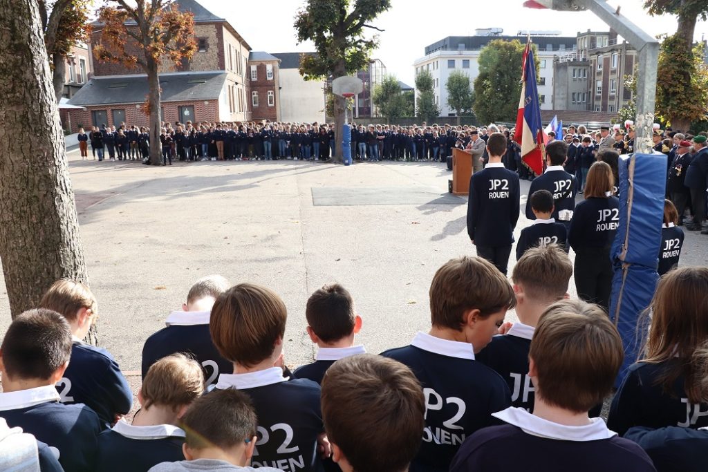 La cour d’honneur de l’Institution Jean-Paul II a vécu, mardi 15 octobre, un événement exceptionnel. En effet, une convention a été signée entre le Souvenir Français et l’Institution, et, à ce titre, un drapeau tricolore a été confié à l’École de la rue de l’Avalasse, en présence d’élus représentant le Maire de Rouen, le Président de Région, Mme la Sénatrice Morin-Dessailly, une délégation de l’École militaire de Saint-Cyr et de nombreux porte-drapeaux.