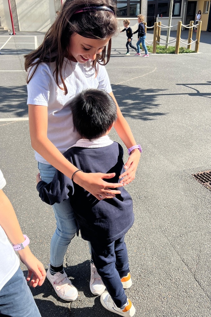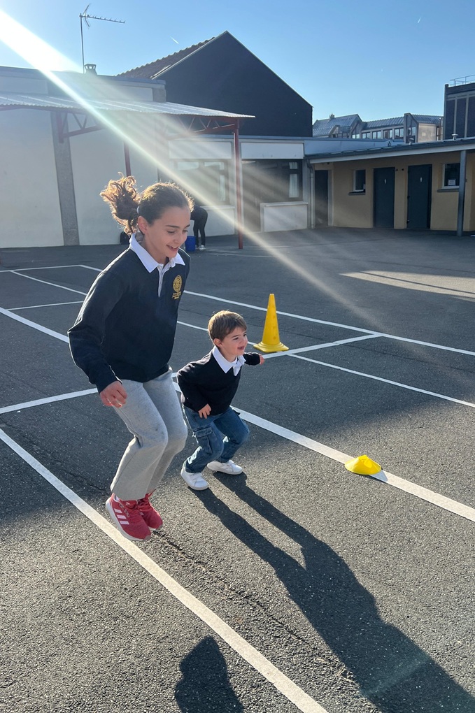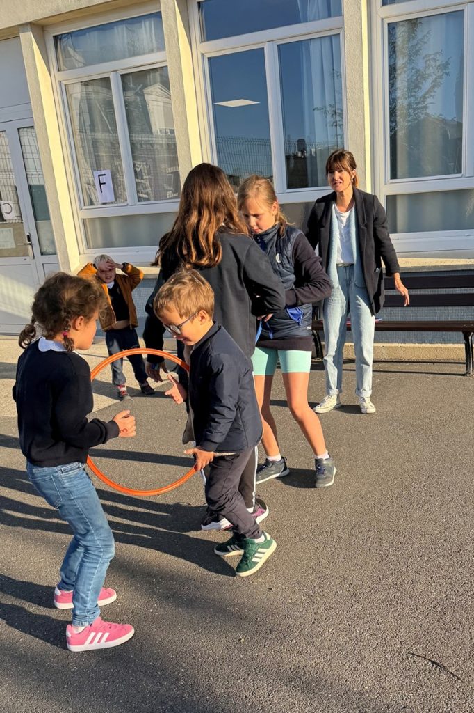 Les rires résonnaient partout. Les petits de Maternelle couraient avec beaucoup d’énergie, encouragés par les grands qui tapaient dans leurs mains. Les plus grands prenaient leur rôle très à cœur : certains guidaient, d’autres expliquaient les règles, et tous soutenaient leurs coéquipiers.