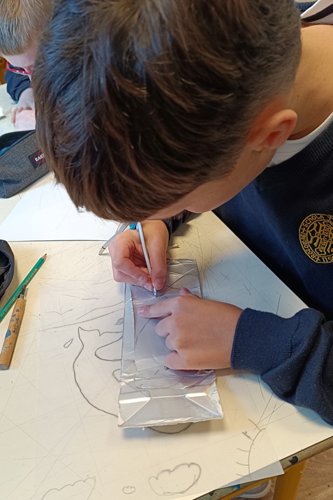 Dans un troisième temps, les élèves ont eu à créer des motifs inspirés du monde végétal ou marin afin de les reporter ce motif sur une plaque de Tetra pack pour la gravure..