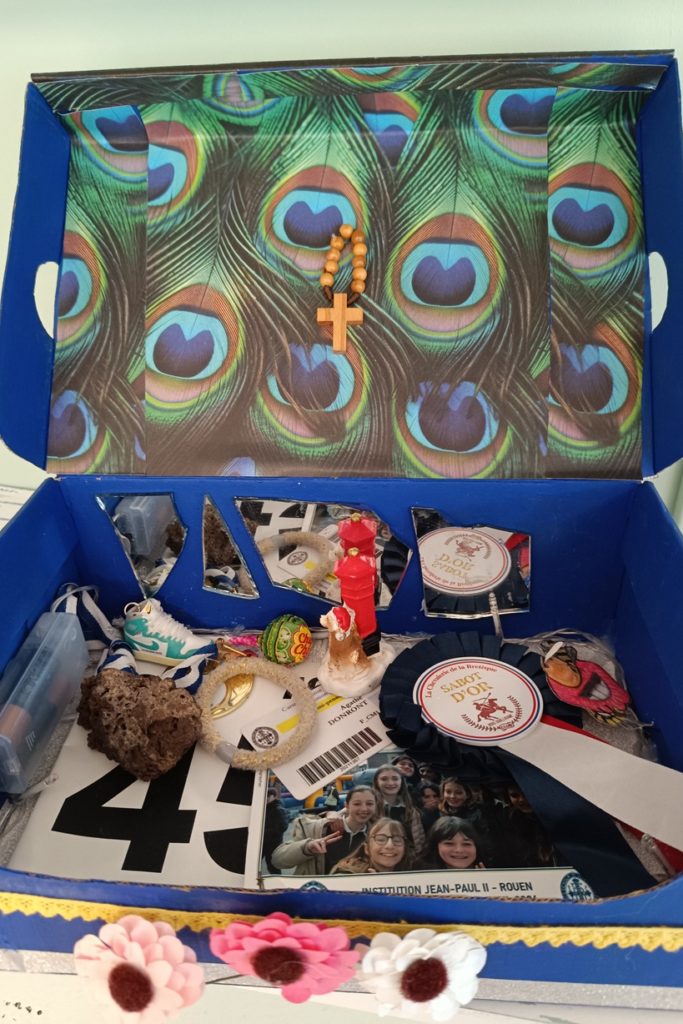 Ce projet a été présenté aux parents en début d’année afin de leurs proposer de garder précieusement la boîte (une fois évaluée), puis de la remettre à leur enfant dans vingt ans. C’est donc à travers un design personnalisé d’une boîte, l’écriture d’une lettre cachetée (intitulée : « Vœux pour mon avenir ») en plus des multiples trouvailles rentrant dans l’application des contraintes du sujet ; que les élèves redécouvriront cette boîte à trésor(s) qui agira comme une machine à remonter le temps et toutes ses émotions.