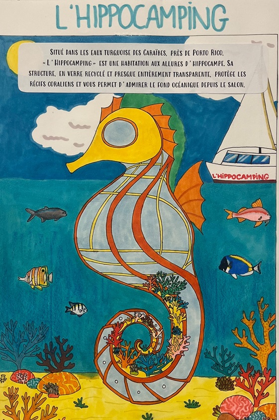 Les élève de Quatrième avaient à concevoir une habitation aux formes organiques sous-marine (qui prendra en compte qu’elle sera aussi un Sanctuaire) conçue pour accueillir la vie sous-marine (développement de la faune et de la flore).