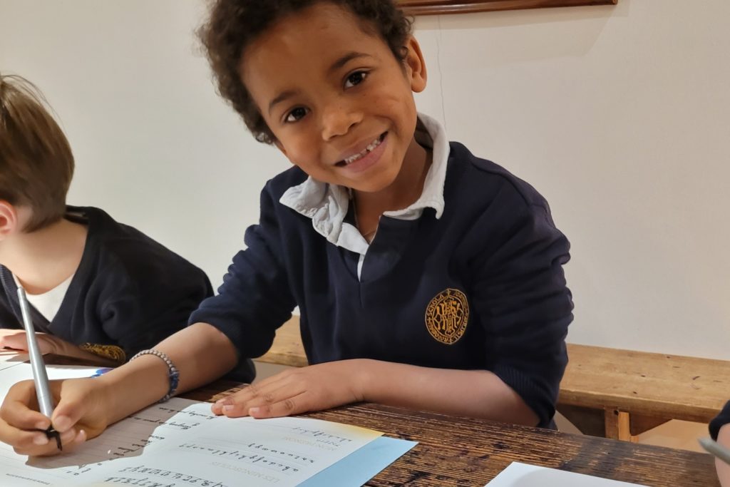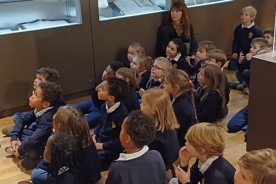 Ce lundi 19 janvier, les 26 élèves de CP n’ont eu qu’à rejoindre la rue Eau-de-Robec pour faire un long voyage dans le temps. Destination : le siècle de Jules Ferry. Au Musée de l’Éducation, tout est prévu pour déambuler dans les couloirs d’autrefois. Le mobilier, les blouses, les tableaux noirs, l’austérité des décors, les vieux squelettes dédiés au cours de sciences naturelles, rien ne manque pour fixer l’époque : nous sommes parachutés dans une salle de classe que fréquentaient nos ancêtres à blouses grises. Quelques guides déploient leurs ailes pour conduire le vol. Mieux ! À l’atterrissage, elles sortent leurs plumes. Au programme : atelier calligraphie. Et nos 26 élèves de CP de découvrir l’art d’écrire à l’encre noire. Ça tache les doigts, ça dérape et ça goutte, oui, mais ça rappelle l’évidence : nous avons décidément bien de la chance de vivre dans notre école haute en couleurs !