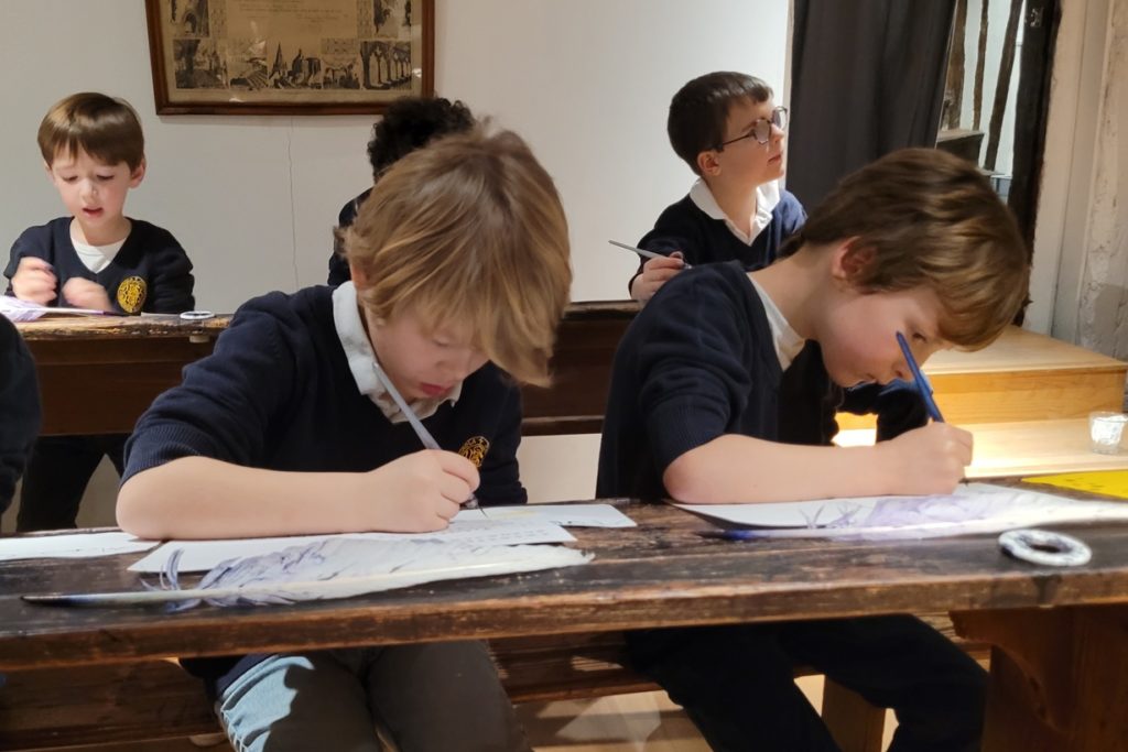 Ce lundi 19 janvier, les 26 élèves de CP n’ont eu qu’à rejoindre la rue Eau-de-Robec pour faire un long voyage dans le temps. Destination : le siècle de Jules Ferry. Au Musée de l’Éducation, tout est prévu pour déambuler dans les couloirs d’autrefois. Le mobilier, les blouses, les tableaux noirs, l’austérité des décors, les vieux squelettes dédiés au cours de sciences naturelles, rien ne manque pour fixer l’époque : nous sommes parachutés dans une salle de classe que fréquentaient nos ancêtres à blouses grises. Quelques guides déploient leurs ailes pour conduire le vol. Mieux ! À l’atterrissage, elles sortent leurs plumes. Au programme : atelier calligraphie. Et nos 26 élèves de CP de découvrir l’art d’écrire à l’encre noire. Ça tache les doigts, ça dérape et ça goutte, oui, mais ça rappelle l’évidence : nous avons décidément bien de la chance de vivre dans notre école haute en couleurs !