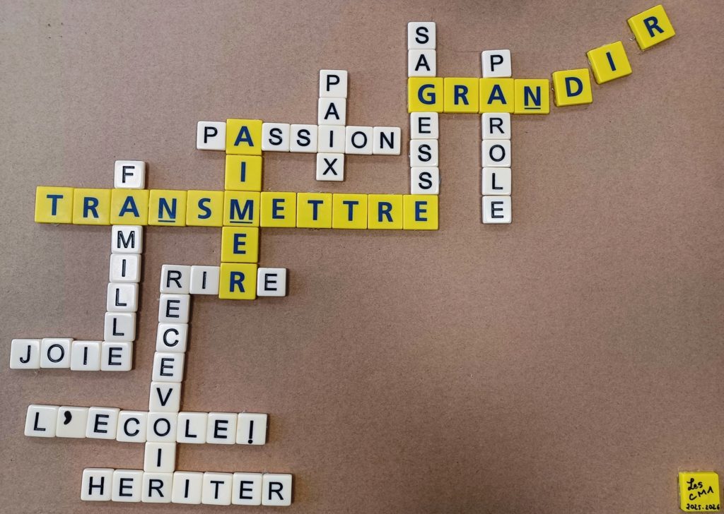 A partir du thème de l’année 2025-2026, « Transmettre », et inspirés par le travail de l’artiste Barbichette, connu pour ses mots-croisés urbains dans les rues de Rouen, les élèves ont assemblé leurs idées sous la forme d’un mots-croisés artistique.