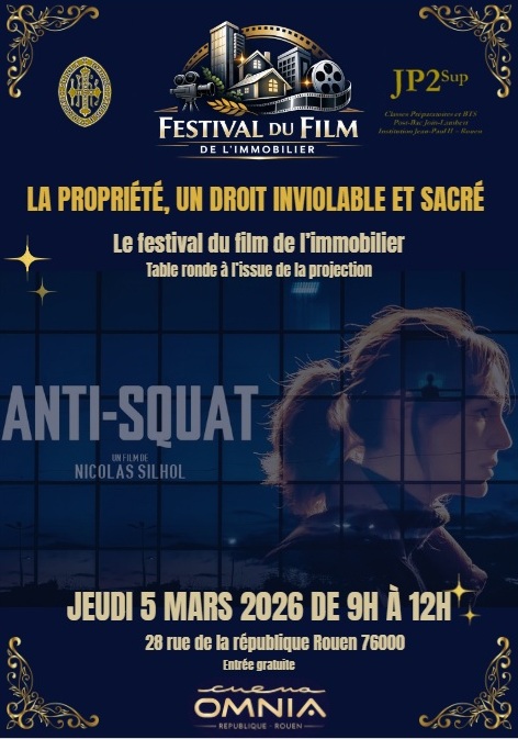 Le Festival du Film de l’Immobilier (FFI) a soufflé une nouvelle bougie le jeudi 5 mars dernier ! Nous avons eu l’honneur d’organiser avec Mme Martin le troisième FFI de Normandie !  Un projet culturel (cinématographique) mais aussi professionnel (en lien avec notre belle et prometteuse Institution supérieure) avec le thème suivant : « La propriété, un droit inviolable et sacré ». Le film choisi a été celui de Nicolas Shiloh : Anti-squat, projeté au cinéma l’Omnia, rue de la République à Rouen.