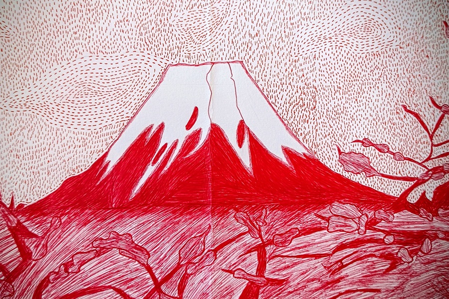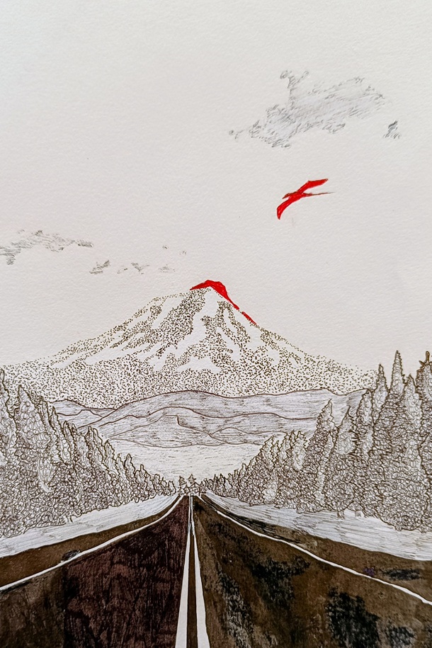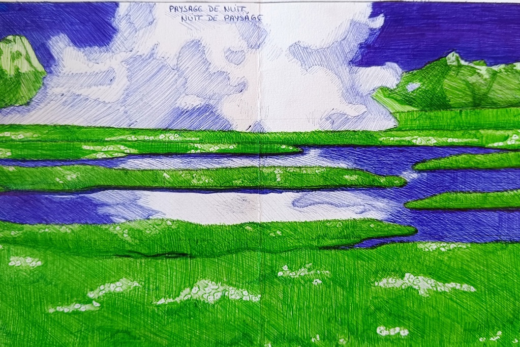 La contrainte technique était d’utiliser trois stylos différents (Bic, plume, feutre fin) afin de rendre des effets graphiques en lien avec la représentation espérée. Le paysage serait monochrome, une couleur supplémentaire pourrait être posée à condition que celle-ci ne dépasse pas 1/3 de la composition.