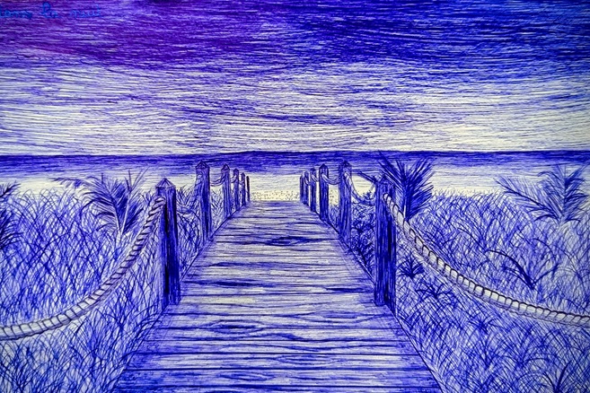 Comment expérimenter les qualités expressives du stylo à bille, un outil qui nous sert habituellement pour l’écriture ? Quelles traces posées au bon endroit dans la composition pour donner plus de relief et de profondeur ? Voici tous les questionnements que les élèves ont dû se poser pendant la réalisation.