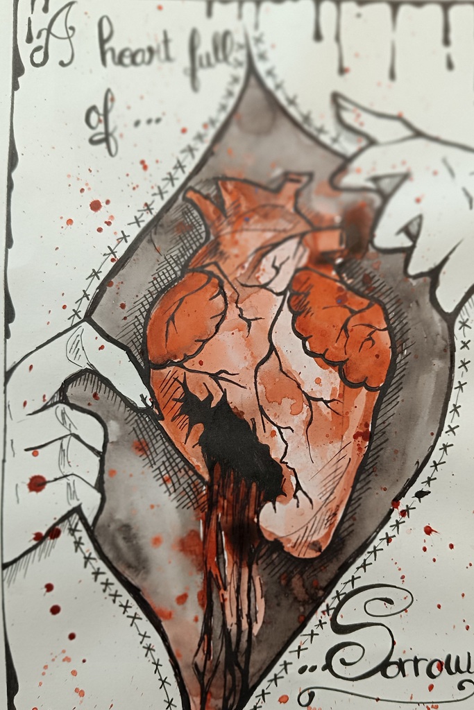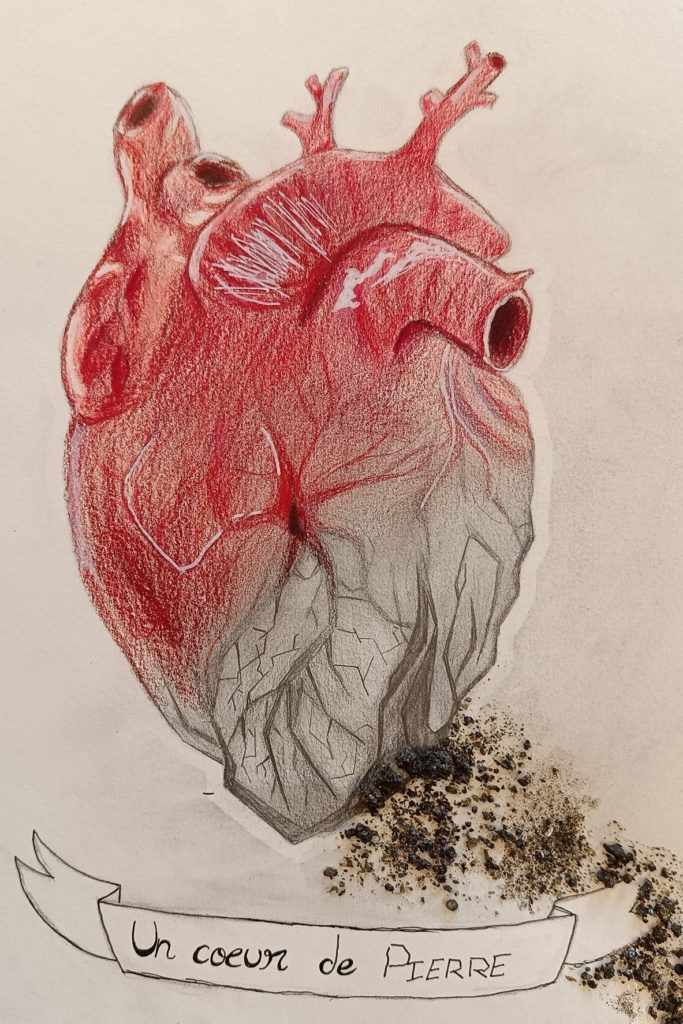 Au niveau des contraintes les élèves avaient à réfléchir sur : un dessin anatomique d’un cœur faisant ressortir : veines, nerfs, aorte, artères, les deux ventricules) associé à l’illustration de l’expression choisie ; l’insertion de matériaux ou matières (non périssables) pour renforcer l’idée ; écrire dans la composition l’expression choisie (attention à sa place dans la composition, à sa lisibilité, à sa typographie) ; travailler les ombres propres et portées, la matière, le graphisme.